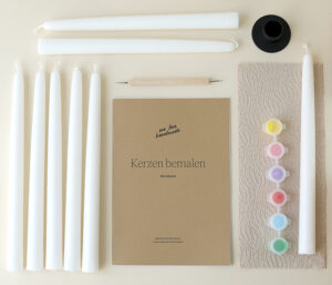 Neu im Shop: Craft Kit Kerzen bemalen – Workbook, Kerzen, Kerzenwachsmalfarben, Kerzenständer, Küchenrolle | we love handmade
