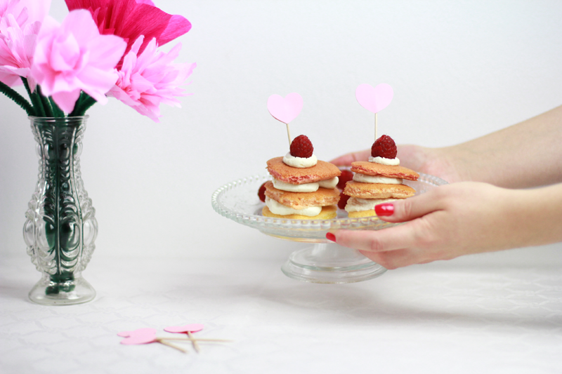 Aus dem Biskuitteig Herzen ausstechen. Die Herzen mit der Topfencreme zu einem Türmchen schichten. Wer mag, kann zwischen Creme und Teig auch noch Himbeeren verstecken. Man kann das Ganze auch in einem Glas schichten oder ähnliches. Ganz wie man möchte.