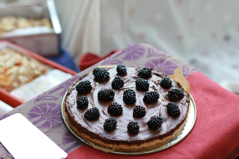 Für das Coulis die Brombeeren mit Zitronensaft und Zucker ein wenig erwärmen, dann pürieren und wenn keine Kerne gewünscht werden durch ein Sieb streichen. Eventuell die Crème de Cassis einrühren. Zur Fertigstellung auf der kalten Schokoladencrème die restlichen Brombeeren dekorativ verteilen, mit dem Coulis beträufeln und wenn noch etwas übrig bleibt zum Kuchenschmaus dazureichen. Und dann: auf die Gabeln, fertig, los!