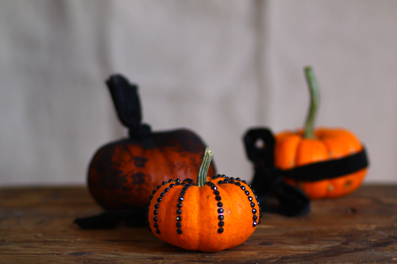 Die Glittersteinchen vorsichtig an den Seiten des kleinen Kürbis ankleben, wenn sie nicht von alleine kleben mit etwas Allzweckkleber unterstützen.