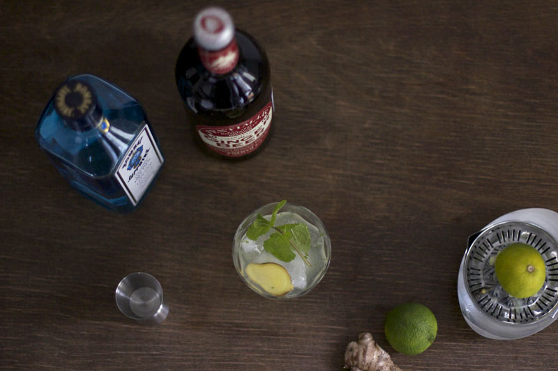 Zuerst Minzblätter und Limettensaft mit einem Stössel zerstossen, den Gin hinzugießen und mit einigen Eiswürfel shaken. Anschließend in ein Glas mit Eiswürfel abseihen und das Gingerbeer hinzugießen, mit einem Minzzweig und einer Ingwerscheibe dekorieren und genießen.
