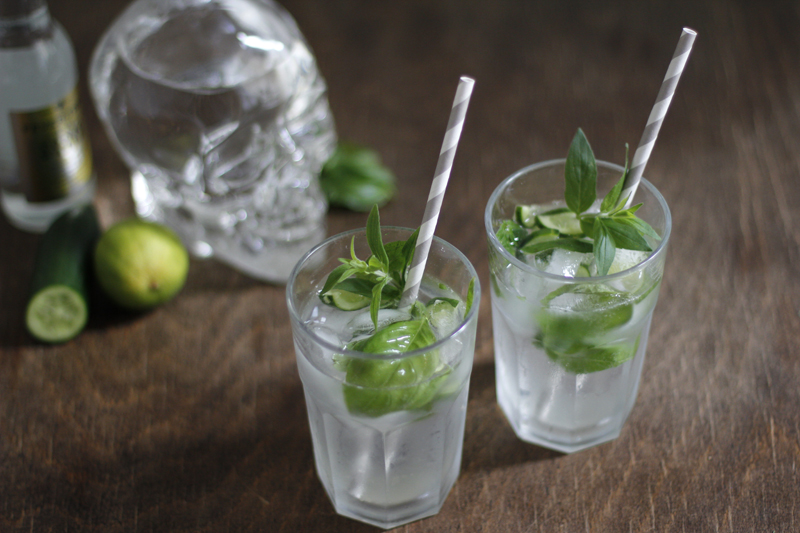 Für unseren Cocktail wird wie immer zuerst das Glas gekühlt. Dann die Minze- und Basilikumblätter waschen, abzupfen und leicht zwischen den Handflächen stampfen. So entfalten sich die Aromen der Kräuter noch besser. Die Gurke in dünne Scheiben schneiden, für noch mehr Aroma nochmals dritteln und mit den Kräutern in das Glas geben.