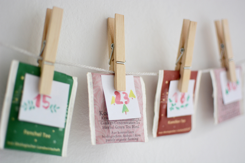 Anschließend befestigt ihr eure Kordel an einem passenden Platz. Und dann kann es eigentlich auch schon losgehen: Mit den Wäscheklammern befestigt ihr nun eure Teebeutel gemeinsam mit den Nummern an der Schnur. Wir haben sie wild durcheinander gehängt. Am besten ihr hängt ganz viele verschiedene Teesorten aus, damit man jeden Tag einen neuen genießen kann. Teeliebhaber werden auf jeden Fall eine Freude an einem solchen Adventkalender haben. Wir auch!