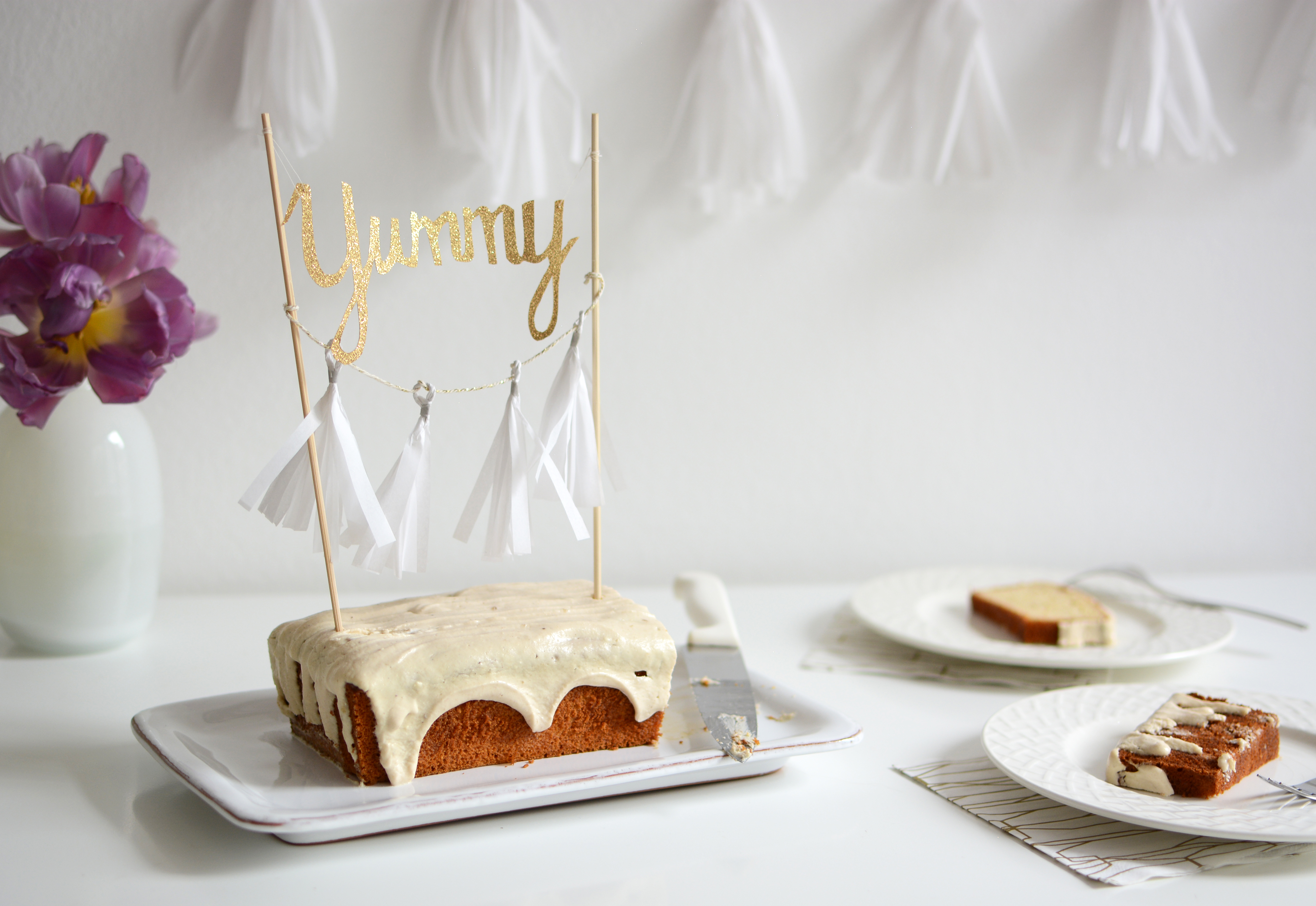 Jetzt, wo der Bananenkuchen fertig ist, könnt ihr ihn noch mit einem feschen Cake Topper pimpen. Das DIY für unsere Variante findet ihr demnächst bei Melanie von Butter & Zucker, bei der wir diese Woche mit eben diesem Do it Yourself zu Gast sein dürfen. Die Vorlage für unseren „Yummy“-Schriftzug findet ihr hier.