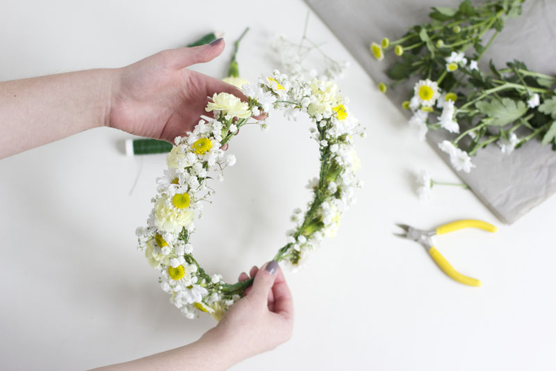Wir haben für unseren Blumenkranz als Basis Schleierkraut verwendet und dazu dann zwei unterschiedliche Margeritensorten und ein paar farblich passende Nelken gebunden. Sobald ihr eure Wahl getroffen habt, kürzt ihr die Blumen zunächst etwas. Achtet dabei aber darauf, dass der Stängel lang genug bleibt, um die Blume später am Kranz befestigen zu können. Drapiert die Blumen auf dem Drahtkranz und bindet sie der Reihe nach mit etwas Schleierkraut auf euren Kranz. Benutzt hierfür den dünneren Blumendraht und bindet alle Blumen gut fest.