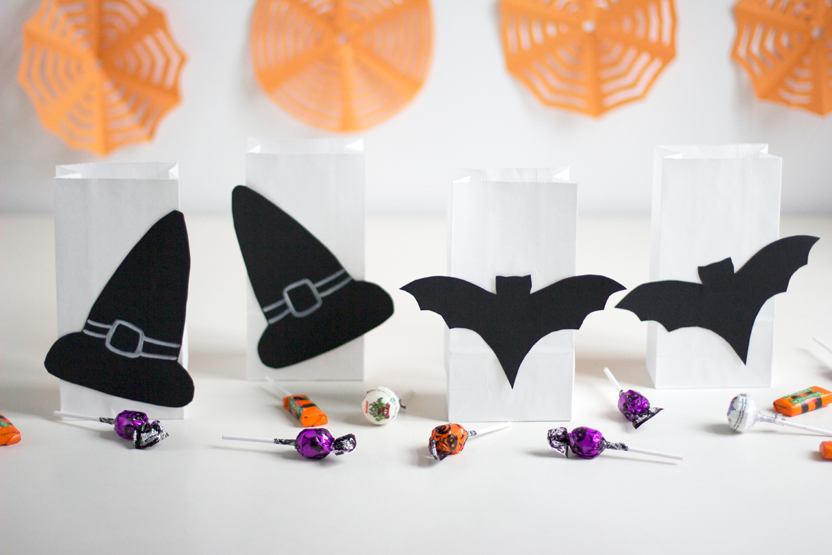 Damit man die Hexenhüte auch wirklich als solche erkennt, haben wir mit einem weißen Filzstift noch ein Hutband und eine Hutschnalle gezeichnet. Bei den Fledermäusen sind eigentlich keine Ergänzungen notwendig. Anschließend könnt ihr eure fertigen Motive auf die Papiersackerl kleben. Dafür könnt ihr einen normalen Bastelkleber verwenden.