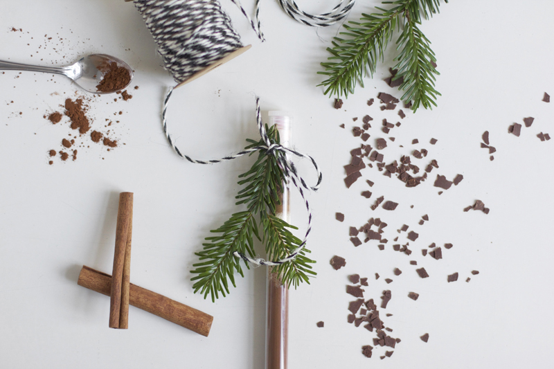 Für dieses Gastgeschenk benötigt ihr zunächst mehrere Röhrchen, wie zum Beispiel diese Reagenzgläser, und die verschiedenen Zutaten für eure selbstgemischte Trinkschokolade. Ihr könnt natürlich zu fertiger Trinkschokolade greifen, oder einfach selbst eine mit Kakaopulver und Rohrzucker zusammenstellen. Füllt dafür zunächst das Kakaopulver, eine Prise Zimt, den Rohrzucker und zum Schluss ein paar Schokoraspeln und Marshmallows in das Röhrchen. Verwendet für das Befüllen eurer Röhrchen am besten einen Trichter, so lassen sich Kakaopulver und Rohrzucker ganz einfach und schnell in die dünne Öffnung füllen. Nach der Kakao- und Zimtschicht das Röhrchen am besten mit etwas Küchenrolle säubern und erst dann mit den weiteren Zutaten fortfahren. Bei den Zutaten könnt ihr natürlich variieren und eure Trinkschokolade so ganz individuell gestalten.