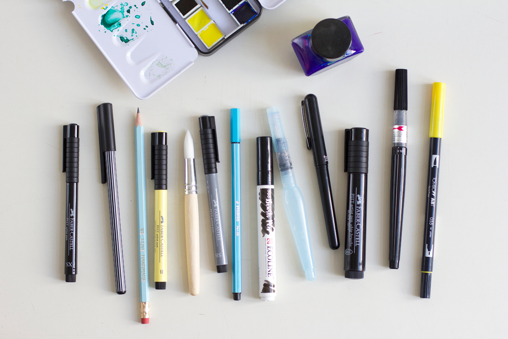 - Besonders spannend, zum kolorieren und schreiben, sind Wasserpinsel, wie zum Beispiel die Water Brush Pens von Pentel, die es in unterschiedlichen Spitzenstärken gibt. Die Wasserpinsel einfach mit Wasser befüllen und Aquarellfarben oder Wasserfarben damit anrühren. Wir arbeiten am liebsten mit Aquarellfarben von Schmincke. Ihr könnt übrigens auch ganz herkömmliche Pinsel zum schreiben und zeichnen verwenden.