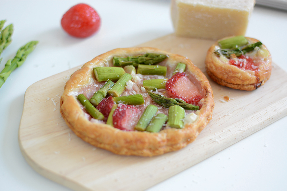Den ausgestochenen Blätterteig auf das Backblech legen und mit etwas Frischkäse bestreichen. Anschließend die geschnittene Jungzwiebel, die Spargelstücke und die Erdbeerscheiben darauf verteilen. Die kleinen Erdbeer-Spargel-Tartes bei 200 Grad für zirka 15 bis 20 Minuten backen. Anschließend mit etwas Salz und Pfeffer würzen und eventuell noch mit frischem Parmesan bestreuen. Die kleinen Tartes können warm genossen werden, eignen sich aber auch super zum Mitnehmen. Viel Spaß beim Ausprobieren!