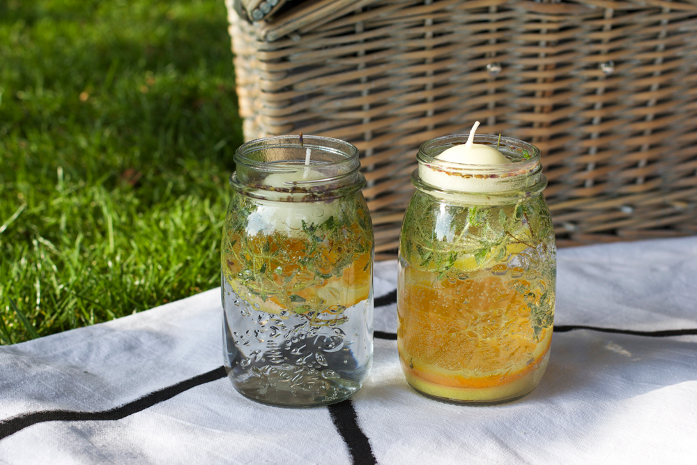 Gebt zunächst die Obstscheiben und die Kräuter in das Glas. Solltet ihr ein Picknick im Park planen, könnt ihr die Kerzen so super vorbereiten, verschließen und mitnehmen. Vor Ort dann das Zitronenöl dazugeben, das Glas mit Wasser auffüllen und eine Schwimmkerze darin platzieren. Fertig ist eure sommerliche Kerze, die nicht nur toll aussieht, sondern im besten Fall auch noch Mücken und lästige Gelsen abwehrt. Die können nämlich den Duft von Zitrone und Co. so gar nicht leiden. Zitronenmelisse soll übrigens auch ganz gut helfen. Die könnte man auch noch mit ins Glas geben. Unser Tipp: Macht gleich mehrere Kerzen, die ihr um euch rumstellen könnt.