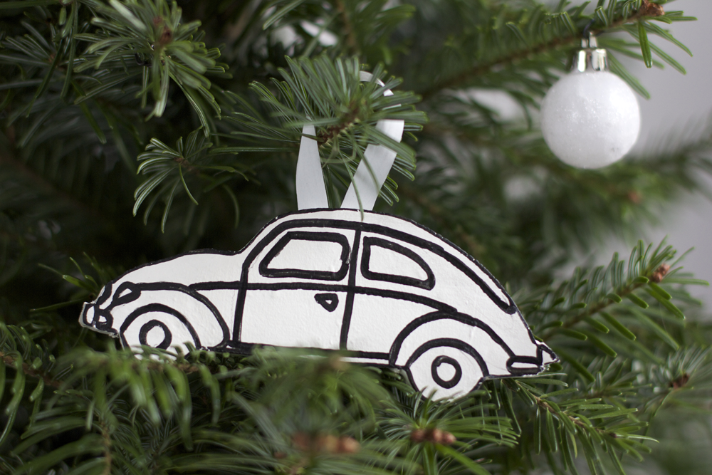 Before you start moulding the clay, you’ll need to think about what kind of shape you want your ornaments to be. We chose a Volkswagen Beetle silhouette. First of all, we sketched out the shape on paper and cut it out. Then we rolled the modelling clay flat on a cutting board. You can use an old rolling pin or a glass bottle with a smooth surface for this. Roll out the clay into a thin layer, place your paper stencil on top, and cut out your shape with a Razor knife.