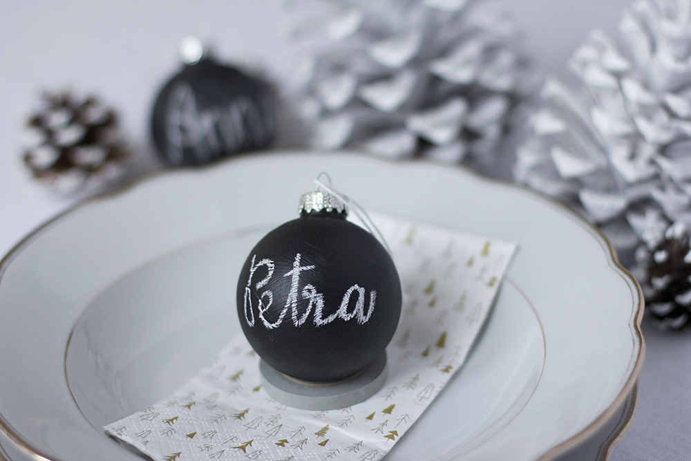 Sobald die Kugeln fertig bemalt und gut durchgetrocknet sind, könnt ihr sie mit Kreide oder einem Kreidestift beschreiben. Der Kreativität sind hier keine Grenzen gesetzt. Da wir unsere Christbaumkugeln als Namenskärtchen umfunktioniert haben, haben wir einfach unsere Namen darauf geschrieben, ihr könnt sie aber natürlich auch mit Bäumen, Sternen und Co. verzieren. So habt ihr dann nicht nur die perfekte Deko für den Weihnachtstisch, sondern auch für den Christbaum!