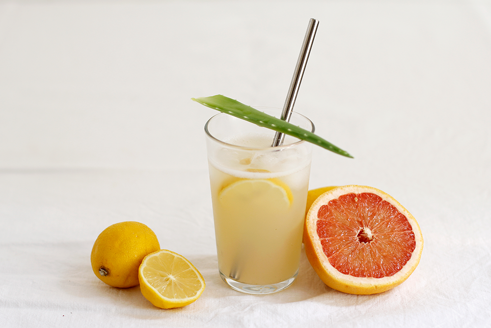 In unserem Büro hat jede von uns eine eigene Wasserkaraffe, um einen Überblick täglichen Flüssigkeitsbedarf zu behalten. Denn wenn man DIYs vorbereitet, fotografiert und textet, kann es schon passieren, dass hin und wieder auf das Trinken vergessen wird. Da wir aber auch sehr gerne ungesüßte selbstgemachte Limonaden mögen, gibt es diesmal einen richtigen frische Kick. Bisher haben wir Aloe Vera nur bei Sonnenbränden auf die Haut aufgetragen, diesmal kommt die Wüstenpflanze anders zum Einsatz:
