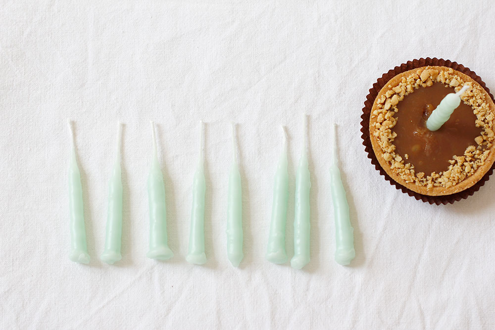 Für den Geburtstag meiner Mama wollte ich dieses Jahr auch die Kerzen für die Geburtstagstorte selber ziehen. Quasi alles sollte einen DIY-Touch haben. Da ich mich das erste Mal am Kerzenziehen probiert habe, waren die kleinen Geburtstagskerzen der ideale Probeversuch. Mein Faible für die Farbe Mint habe ich immer noch nicht abgelegt, daher wurden diese kleinen Kerzen selbstverständlich auch leicht Pastellmint. Auf der kleinen Tarte machen sich die selbst gezogenen Geburtstagskerzen richtig gut, jetzt fehlt nur mehr die Feuertaufe.