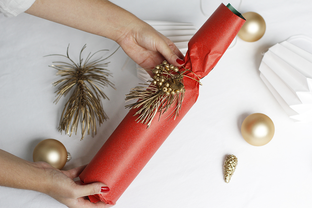 Zunächst die Tannenzweige, Beeren und Co. auf alte Zeitungen legen und am besten im Freien mit Goldlack besprühen. Achtet dabei darauf, wirklich alle Seiten schön einzusprühen und lasst den Lack anschließend am besten über Nacht trocknen. Verpackt schon einmal die Flasche mit Packpapier. Wir haben zu einem roten Packpapier gegriffen, das schön weihnachtlich aussieht.