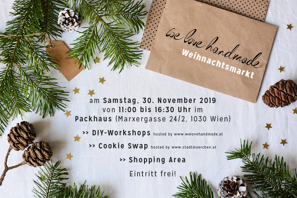 Wir laden am Samstag, 30. November 2019 von 11:00 bis 16:30 Uhr zum we love handmade Weihnachtsmarkt in das Packhaus (Marxergasse 24/2, 1030 Wien) ein! Es erwarten euch ausgewählte Aussteller, DIY-Workshops passend zur Weihnachtszeit und die liebe Mara von Stadtmärchen wird einen Cookie Swap hosten!