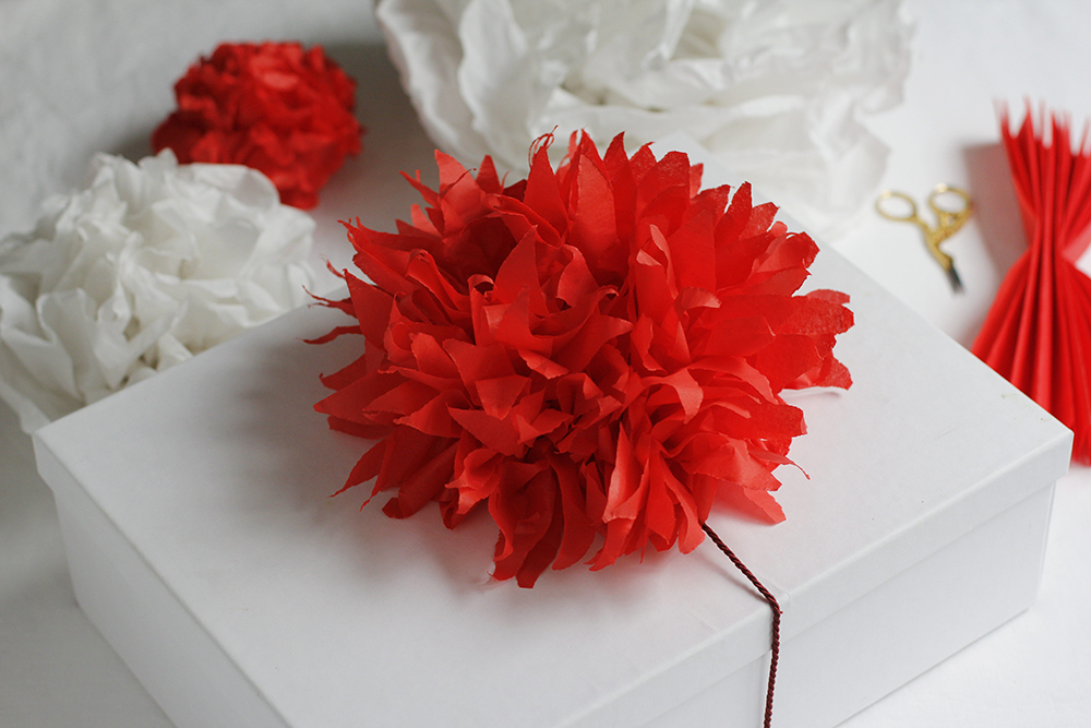 Zunächst die beiden Enden mit einer Schere zuschneiden. Wir haben uns für spitze Kanten entschieden, man kann die Enden aber natürlich auch rund zuschneiden, wie bei unseren Kürbissen aus Seidenpapier. Das Ganze anschließend direkt mit der Kordel auf das Päckchen binden und die einzelnen Seidenpapierlagen vorsichtig öffnen, sodass eine wunderschöne Seidenpapierblume entsteht. Auf einem weißen Päckchen kommt die rote Blume gleich noch besser zur Geltung. Bei Farbe, Größe und Form sind eurer Kreativität jedoch keine Grenzen gesetzt. Wir wünschen ganz viel Spaß beim Nachmachen!