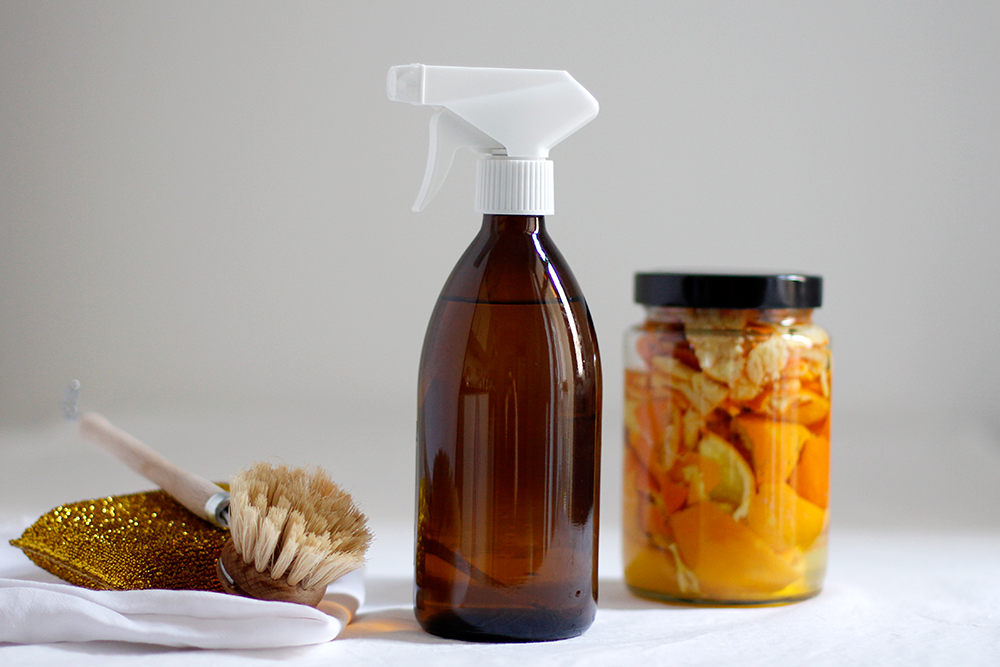 Nachdem ihr ein paar Wochen gewartet habt, den angesetzten Essig mit einem Sieb in eine Sprühflasche abseihen und als Allzweckreiniger verwenden.