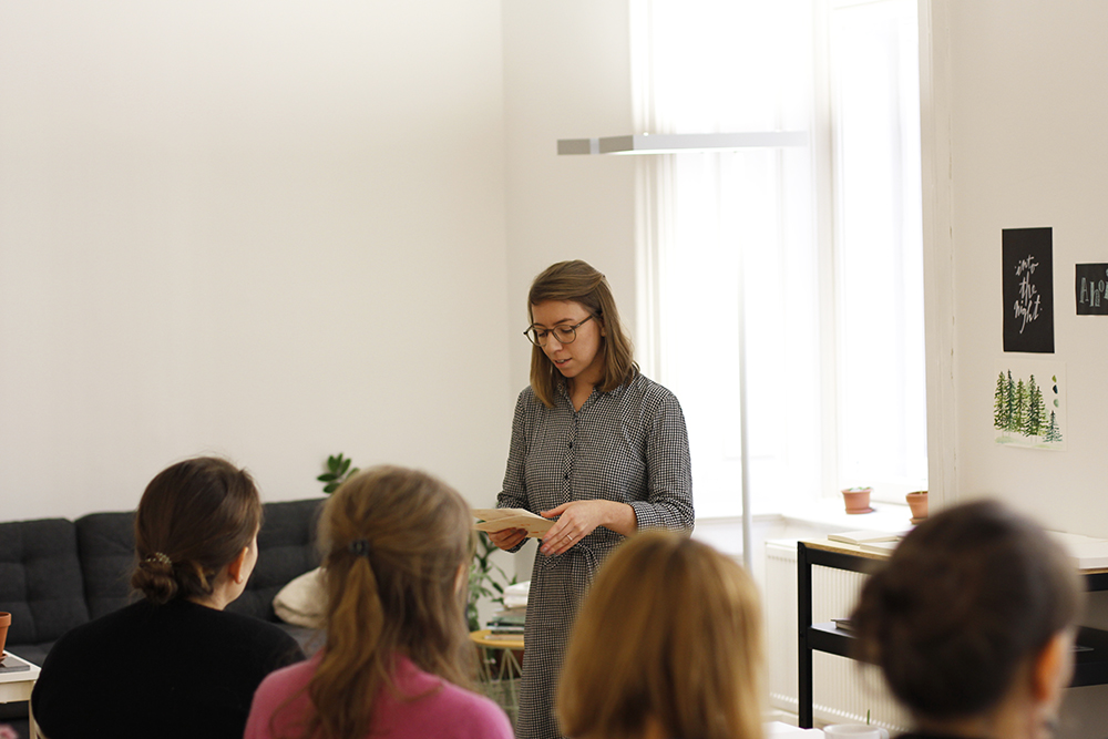 Am Vormittag stand das Brush Lettering am Programm. Hier haben die Teilnehmerinnen Schritt für Schritt das Schreiben mit den Pinselstiften gelernt. Das heißt wir haben uns zunächst die verschiedenen Grundtechniken angesehen und sind danach Blatt für Blatt das Alphabet durchgegangen. Dabei konnten die Teilnehmerinnen aus einem simplen und einem etwas moderneren Schriftstil wählen und ihr eigenes Alphabet erstellen. Vor Ort gab es außerdem viele verschiedene Brush Pens ganz unterschiedlicher Marken, durch die man sich probieren konnte. Ein Highlight für uns: Die einzelnen Übungen haben wir dieses Mal mittels Kamera und Beamer einfach auf eine große Wand projiziert. So hatten wir weniger Stress und es blieb auch ein bisschen mehr Zeit zum Üben.