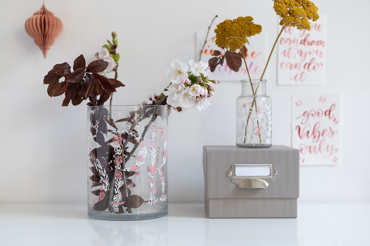 Wie ihr vielleicht bemerkt habt, haben wir in den letzten Wochen unseren Webshop mit einigen neuen Produkten befüllt. Neben unseren Craft Kits und Kalligraphie-Zubehör könnt ihr bei uns nun auch unsere liebsten Marker, Pinsel und Brush Pens kaufen. Beim Fotografieren der Produkte haben wir gleich Lust bekommen, mehr damit zu machen und dachten uns, dass wir euch einfach ein paar nette DIY-Ideen mit unseren neuen Produkten vorstellen. Heute stehen unsere Kreidemarker im Fokus. Mit denen lassen sich nämlich im Handumdrehen alte Glasvasen bemalen und so in eine hübsche Frühlingsdeko verwandeln. Wir haben zwei Varianten für euch zum Nachmachen!
