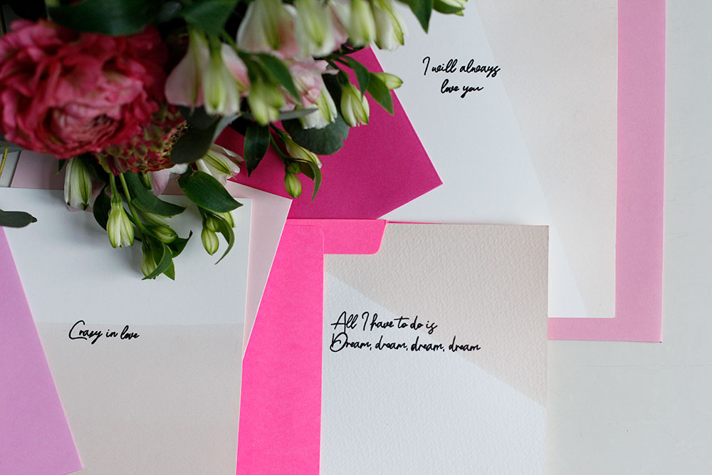 • Die Valentinskarten für dieses Kalligraphie-DIY könnt ihr euch ganz einfach bei uns herunterladen. Die mit der Spitzfeder gestalteten Valentinsgrüße eignen sich außerdem super, um eine persönliche Notiz auf der Rückseite zu versenden! Was wir uns auch sehr gut vorstellen können: Die Karten im Mini-Format ausdrucken und in einem Blumenstrauß verstecken.
