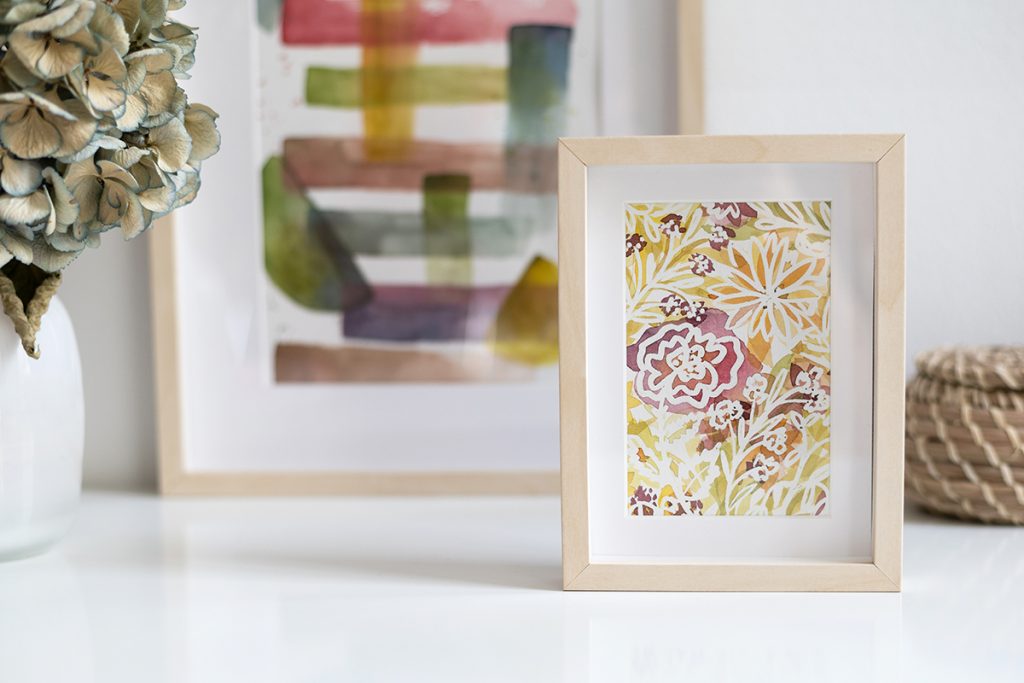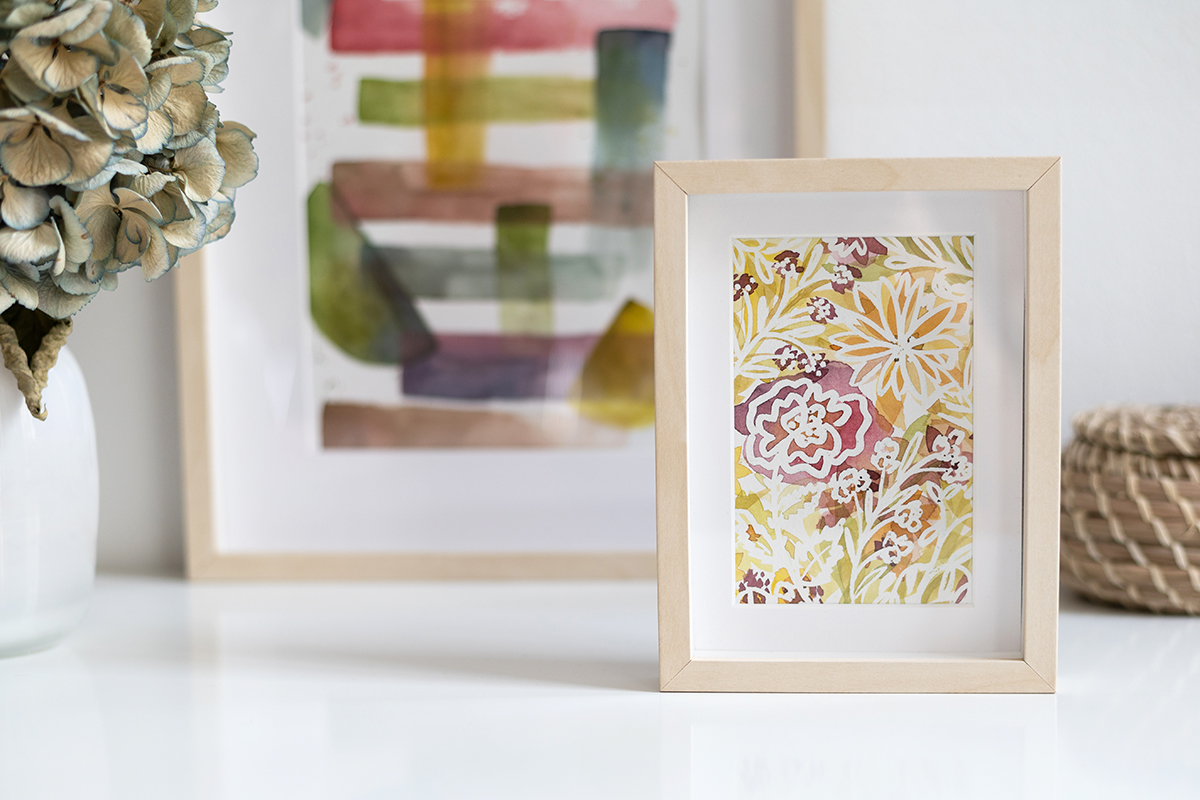 Sobald die Aquarellfarben gut durchgetrocknet sind und ihr zufrieden mit eurem Bild seid, könnt ihr die Maskierflüssigkeit wegrubbeln. Wir verwenden dafür am liebsten einen Radiergummi oder auch ein trockenes und sauberes Mikrofasertuch. Einfach leicht rubbeln, und schon löst sich das Masking Fluid vom Papier. Wir haben unser Bild gleich gerahmt und es zu unserem abstrakten Aquarellbild dazugestellt. Das eignet sich übrigens auch super als Einstiegs-DIY.