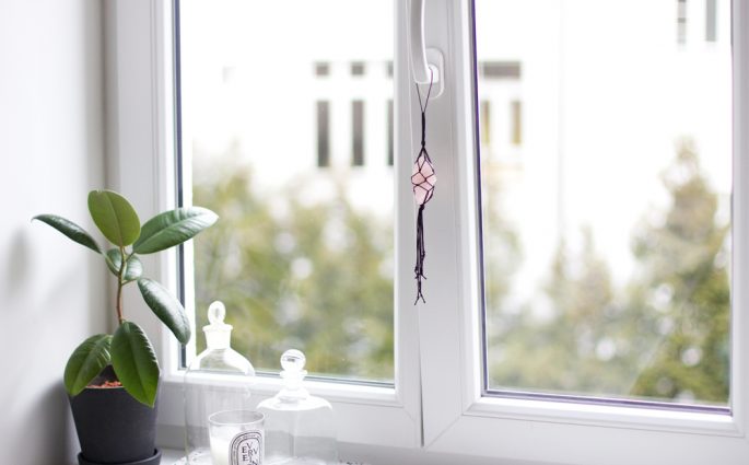 Vor ein paar Jahren, habe ich diesen kleinen Rosenquarz geschenkt bekommen und seit dem steht er bei mir am Schreibtisch. Er ist meistens von der einen auf die andere Seite des Tisches gewandert. Doch jetzt hat er endlich ein fixes Plätzchen. Denn ich habe ihm Dank Makramee eine Aufhängung geknüpft.