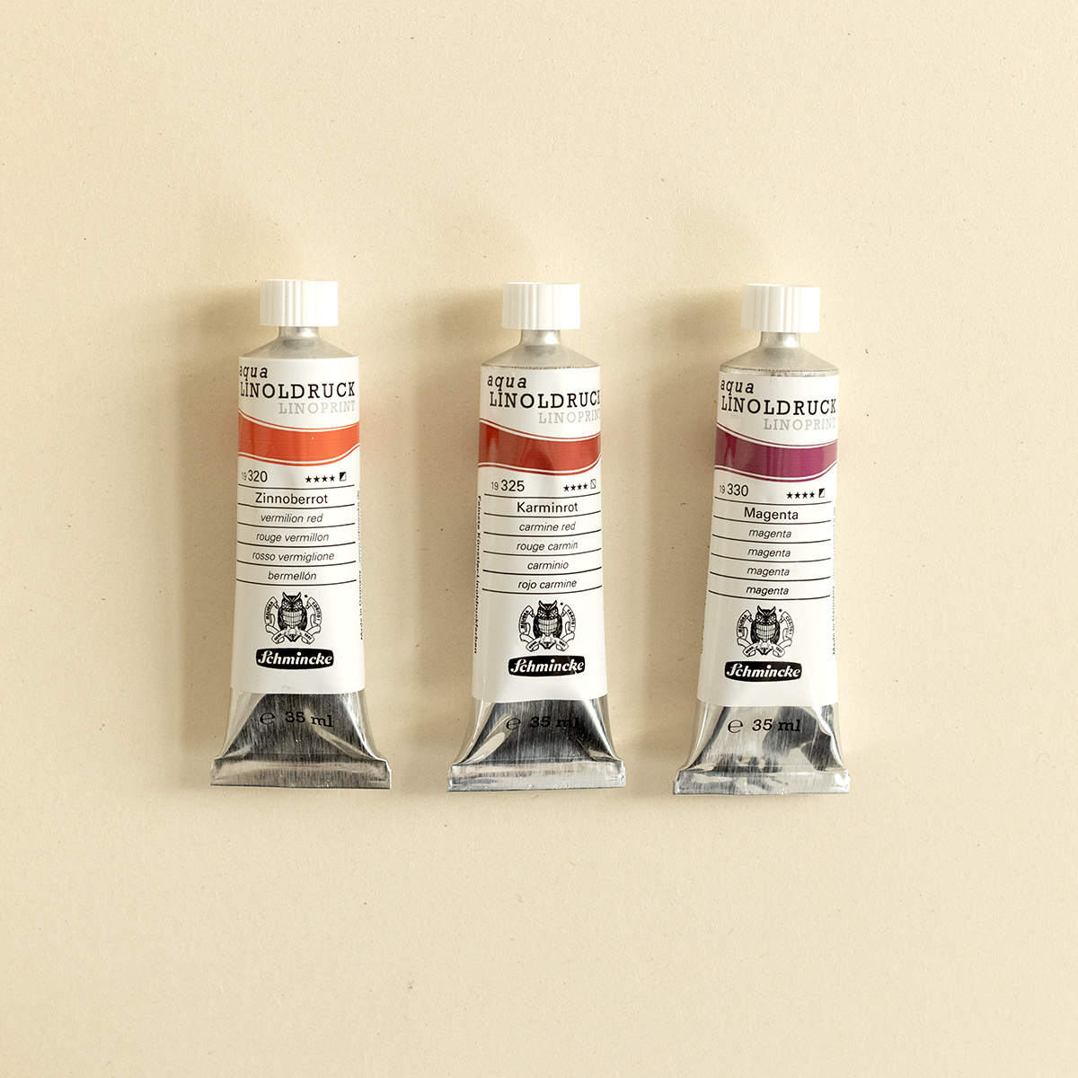 | Linoldruckfarbe | 210 Permanentgelb, 220 Indischgelb, 320 Zinnoberrot, 325 Karminrot, 330 Magenta, 435 Preußischblau, 430 Ultramarin, 440 Cyan, 520 Permanentgrün, 530 Chromoxidgrünton, 735 Elfenbeinschwarz |