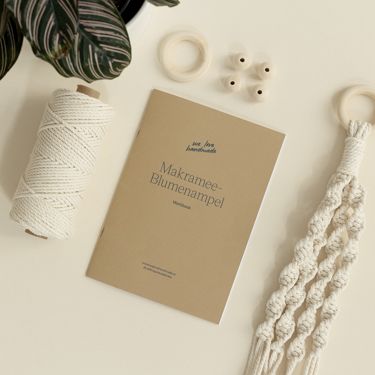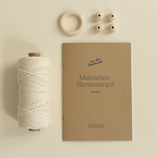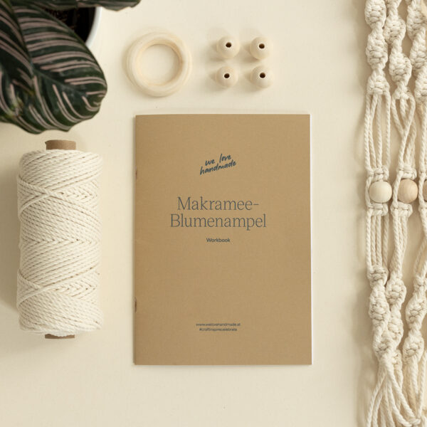- Workbook (16 Seiten) mit Materialkunde, Schritt-für-Schritt-Anleitung zum Thema Makramee inklusive genauer Anleitung für die abgebildete Makramee-Blumenampel und den wichtigsten Makramee-Knoten im Detail.