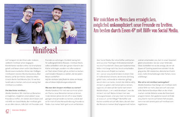 Auf Instagram ist den Einen oder Anderen vielleicht minifeast schon begegnet. Köstlichkeiten werden online via Smartphone geteilt und lassen einem sofort das Wasser im Mund zusammenlaufen. Hinter den fleißigen minifeastern stecken Monika Kanokova, Blair Brooks, Leif & Sam Parker. Zwischen Wien-Utrecht-Berlin fand Monika Zeit, für we love handmade zu kochen